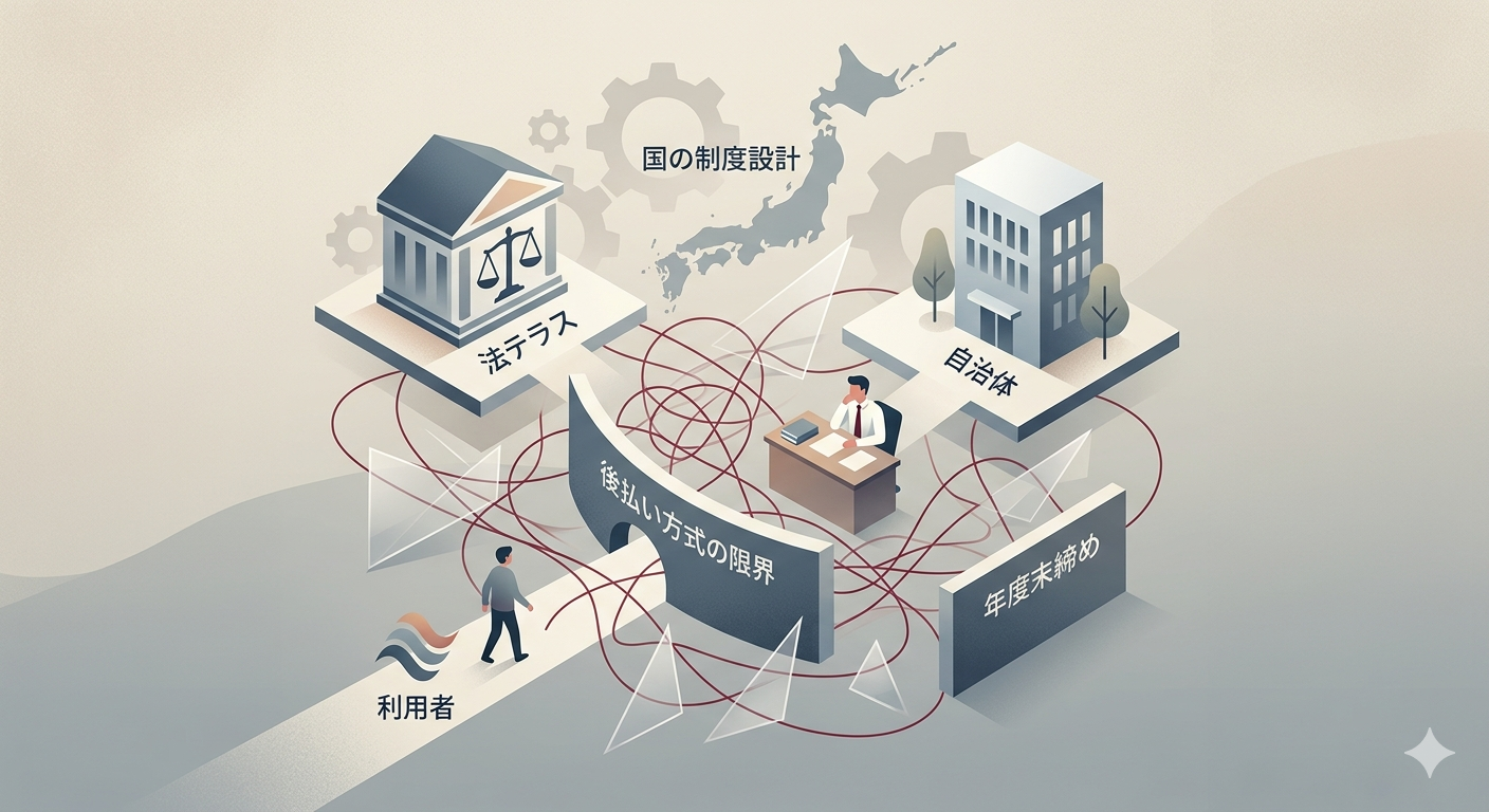 同時に、制度の複雑さは運営側の負担をも増大させる。自治体にとって、司法制度や法テラスを扱う業務は本来業務とは言い難く、組織内では独特の「異物感」を伴う領域である。そのような分野において、難解な管理事務を維持することは、組織的な理解や実務の習得に多大なコストを要することを意味する。